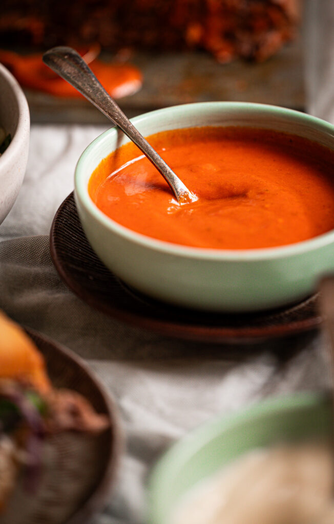 Blend until smooth — a powerful blender will give you that silky consistency and saturated creamy tomato colour.