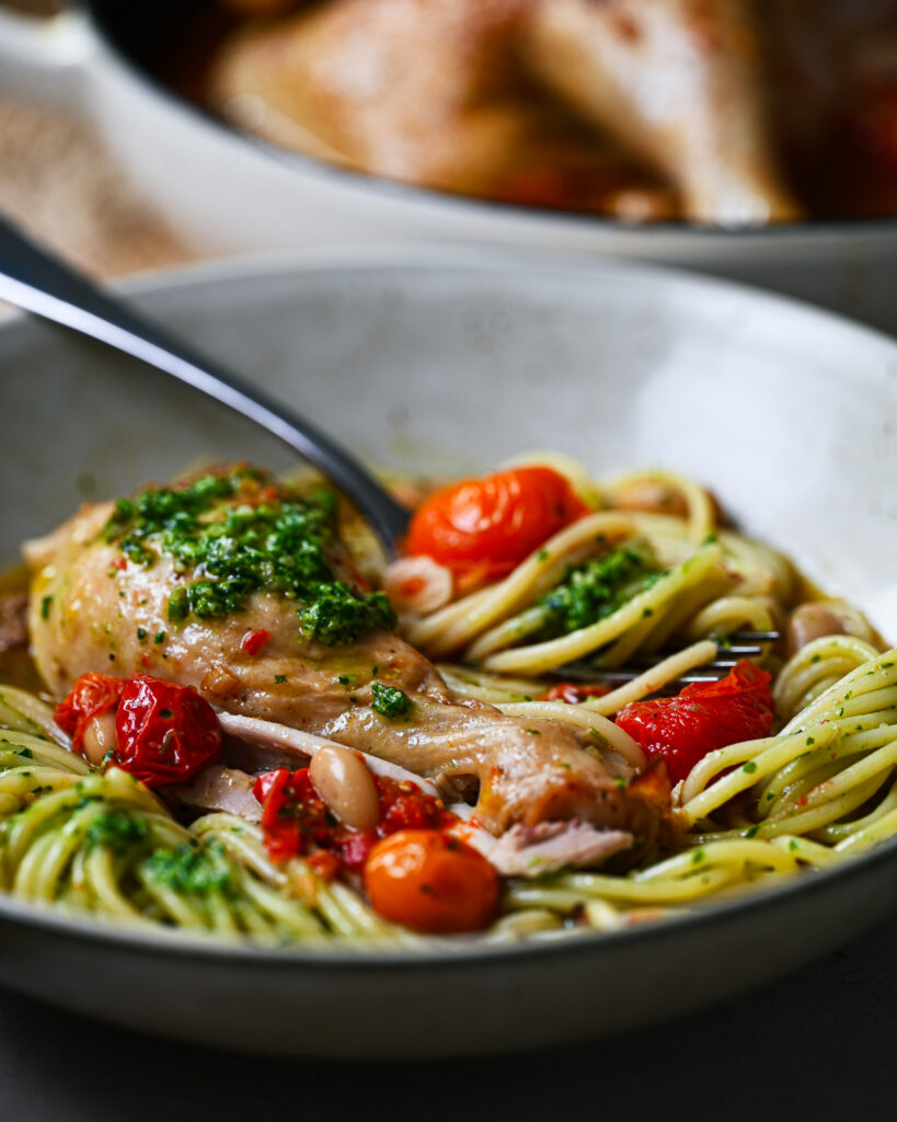 The beans soak up all those golden pan juices, the tomatoes burst and sweeten, and everything comes together in the kind of meal that feels both generous and effortless.