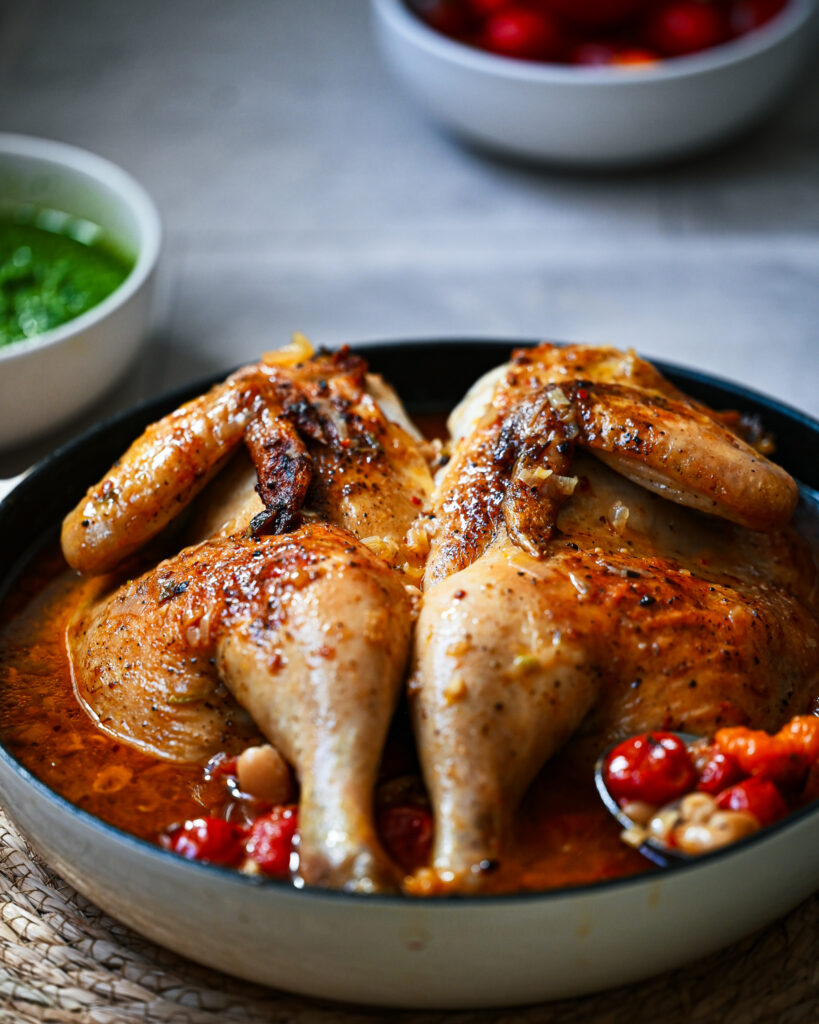 There’s something deeply satisfying about a dinner that looks impressive but barely asks anything of you. This one-pan butterflied chicken bakes right on top of a garlicky tomato and cannellini bean base, creating its own rich,