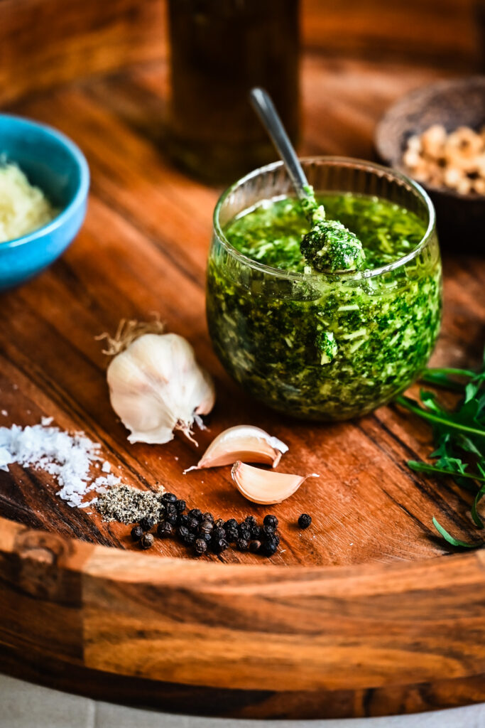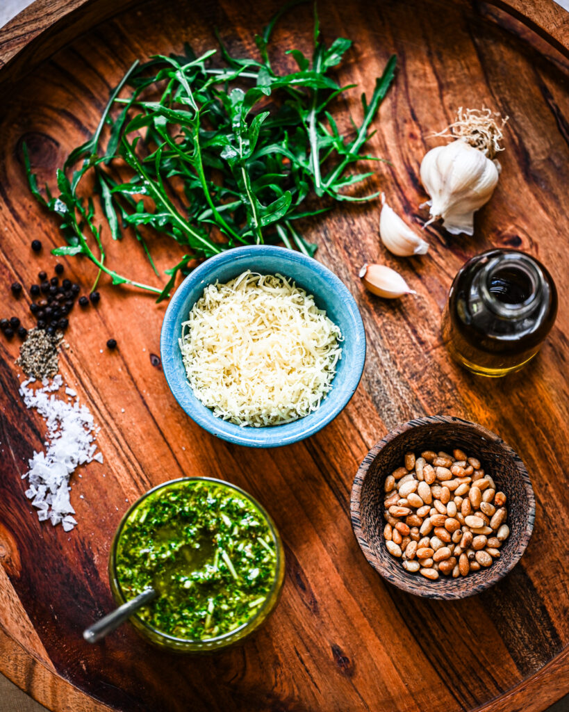 A fresh, peppery rocket pesto made with toasted pinenuts, parmesan, and extra virgin olive oil — simple, vibrant, and endlessly versatile.