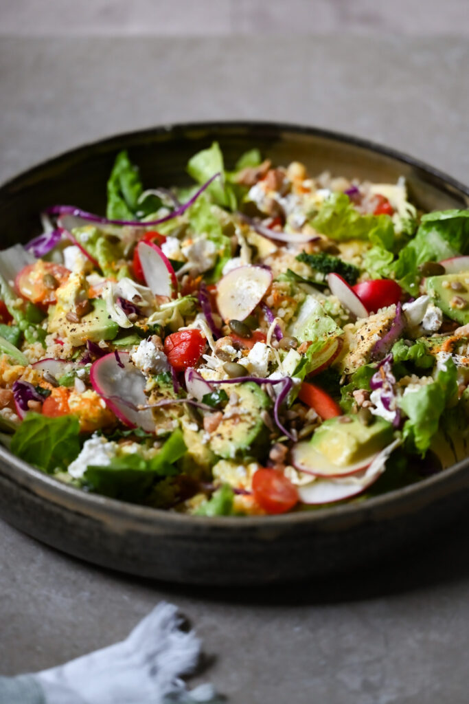 Cheese is often my go-to — feta, blue, or parmesan. If I’m using a creamy dressing like green goddess, I’ll skip the cheese or swap in boiled eggs.