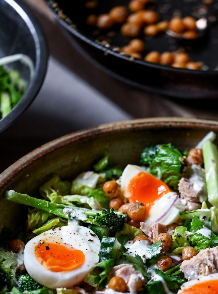 This one’s deeply satisfying — the kind of salad that feels good and keeps you full. It makes a great make-ahead lunch, but I’d happily eat it for dinner too. The creamy Caesar-style dressing skips the anchovies (so my son will eat it) and is a lighter, fresher take on the classic.
