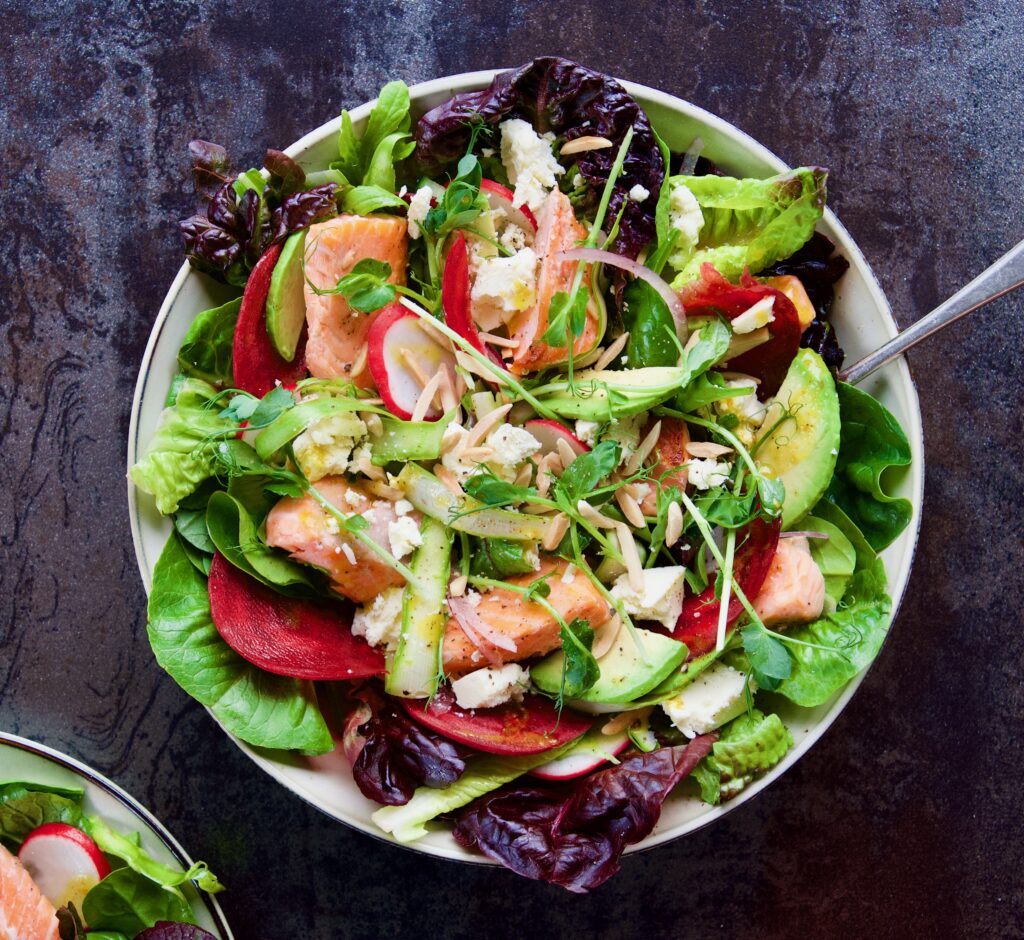 A fresh, vibrant salmon salad layered with crisp spring vegetables and finished with a citrus-bright dressing. Light, nourishing, and perfect for lunch or a relaxed dinner.